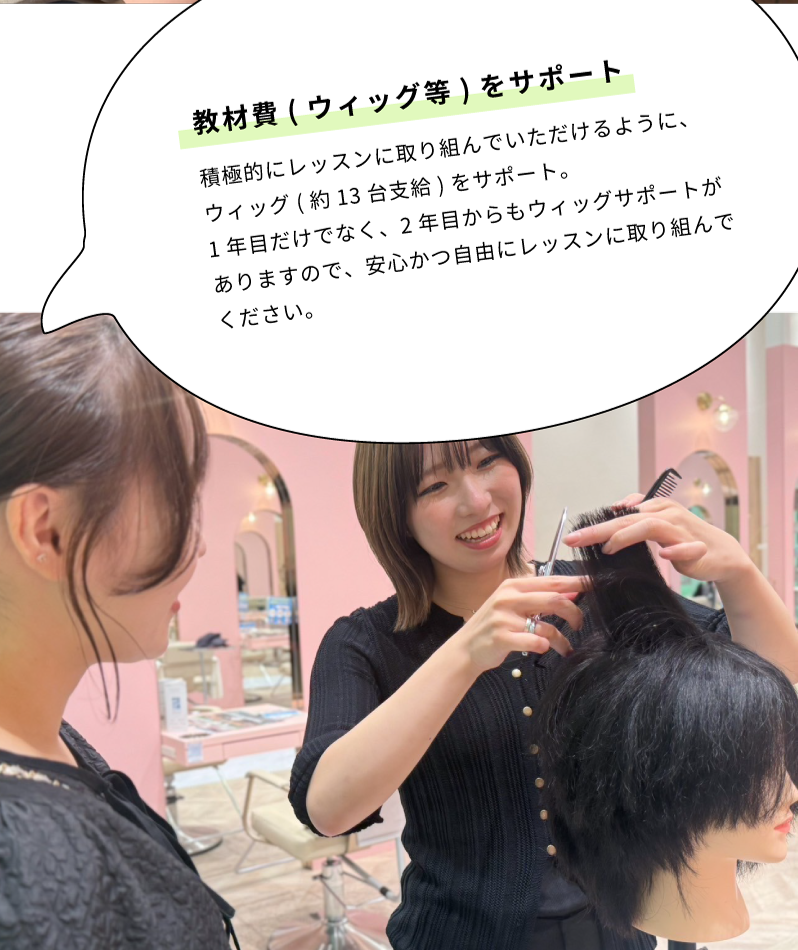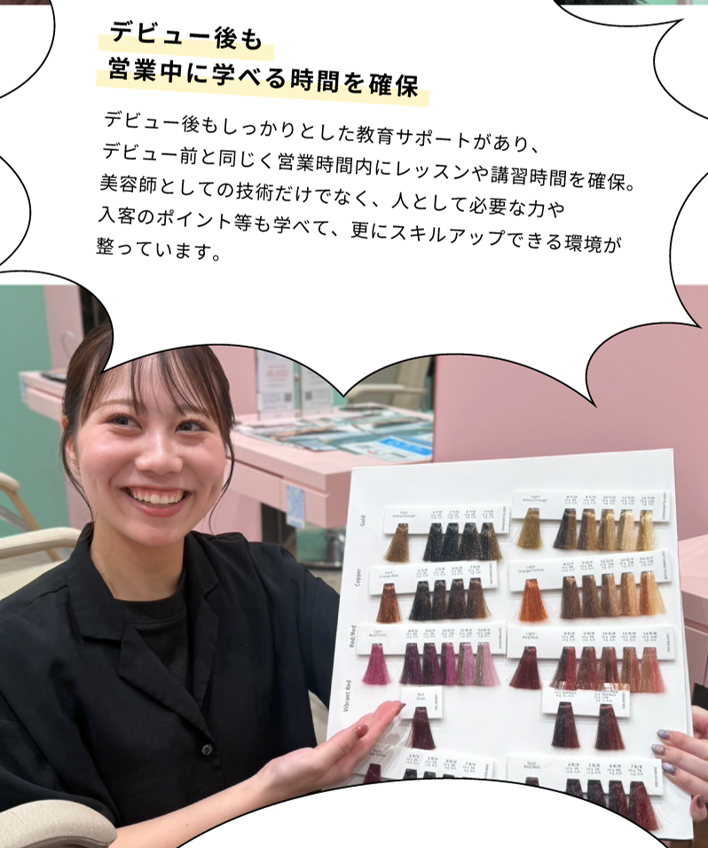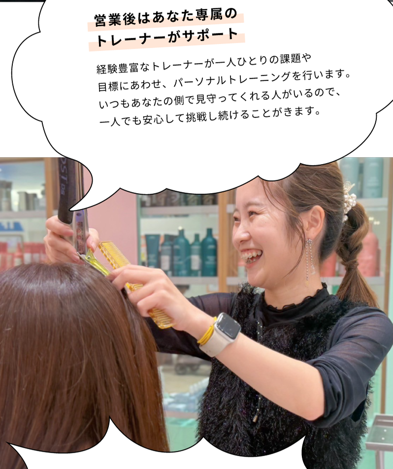 | 給料 | □ スタイリスト(中途採用)基本給 300,000円〜(見込み残業手当を含む)【6ヶ月保証(延長あり)】 □ Jr.スタイリスト(中途採用)基本給 250,000円〜(見込み残業手当を含む) □ アシスタント(中途採用)基本給 230,000円〜(見込み残業手当を含む) |